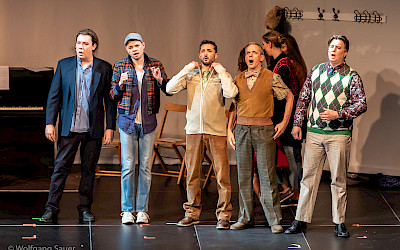 Zeitgleich steht der Chor auf der großen Bühne und wartet nervös auf Daniel und Lena. Sie kommen nicht. Tores Unruhe äußert sich in dem ihm ganz eigenen Ton.